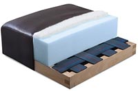 Foam is a substance that is formed by trapping pockets of gas in a liquid or solid. A sponge used for washing dishes is an example of a foam, as is a mass of soap bubbles, but for the purpose of this site, the term foam generally refers to foam which is used in furnishings, mattresses and the like, often made from polyurethane, with many different variants, densities and qualities. Polyurethane is a type of polymer (from the Greek words poly meaning "many" and mer meaning "parts"), often referred to as PU or PUR. Polyurethane foam is created by the formation of gas bubbles inside the material. An important division of solid foams is into closed cell foams and open cell foams. In closed cell foam, the gas forms separate pockets, each completely surrounded by the solid material. In open cell foam, the gas pockets connect with each other. A household sponge is an example of open cell foam, in which water can easily flow through the entire structure, displacing the air. A swimming pool float or camping mat are examples of closed cell foam, the gas pockets are sealed, thus water cannot get in. | ||||||||